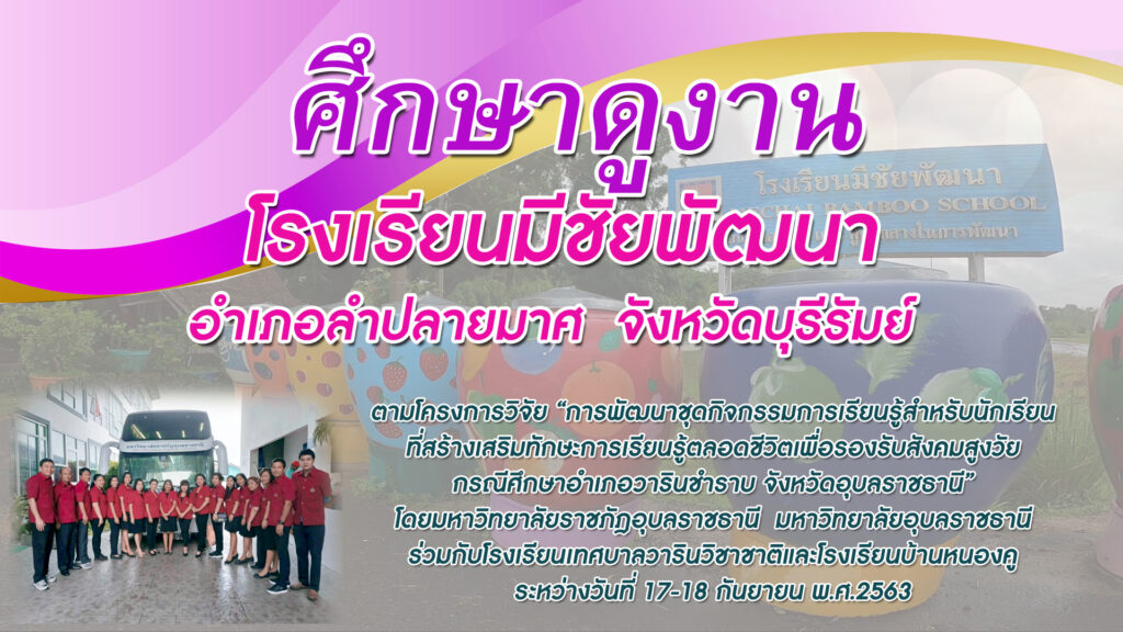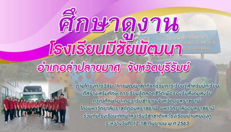 มหาวิทยาลัยราชภัฎอุบลราชธานี และมหาวิทยาลัยอุบลราชธานี นำคณะครูโรงเรียนเทศบาลวารินวิชาชาติ และโรงเรียนบ้านหนองคู ศึกษาดูงานโรงเรียนมีชัยพัฒนา อำเภอลำปลายมาศ จังหวัดบุรีรัมย์ ตามโครงการวิจัย “การพัฒนาชุดกิจกรรมการเรียนรู้สำหรับนักเรียนที่สร้างเสริมทักษะการเรียนรู้ตลอดชีวิตเพื่อรองรับสังคมสูงวัย กรณีศึกษาอำเภอวารินชำราบ จังหวัดอุบลราชธานี” ระหว่างวันที่ 17-18 กันยายน 2563