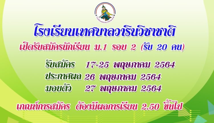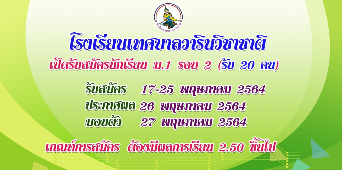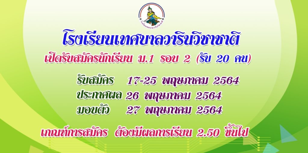 โรงเรียนเทศบาลวารินวิชาชาติ รับสมัครนักเรียนเข้า ม.1 รอบ 2 รับจำนวนจำกัดเพียง 20 คนเท่านั้น โดยจะเริ่มรับสมัครวันที่ 17-25 พฤษภาคม 2564 ประกาศผลวันที่ 26 พฤษภาคม 2564 และมอบตัววันที่ 27 พฤษภาคม 2564 นักเรียนที่จะสมัครต้องมีผลการเรียน 2.50 ขึ้น สมัครได้ที่ห้องธุรการ อาคารอำนวยการ ในวันเวลาราชการเท่านั้น หากผ่านกำหนดเวลาดังกล่าวถือว่าหมดสิทธิ์สมัครเข้าเรียนทุกกรณี