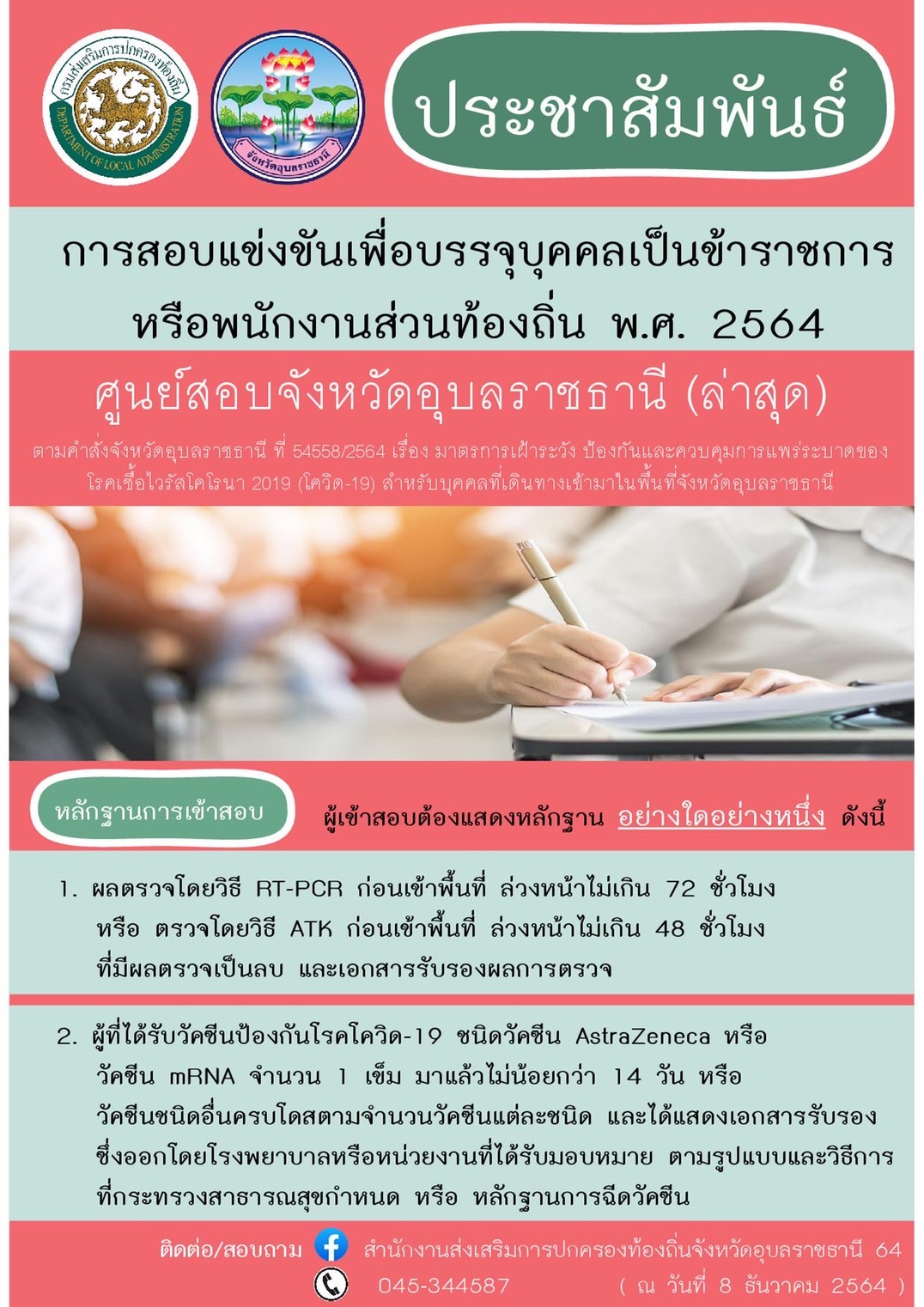 กลุ่มบริหารงานทั่วไปข่าวประชาสัมพันธ์ สนามสอบแข่งขันเพื่อบรรจุบุคคลเป็นข้าราชการหรือพนักงานส่วนท้องถิ่น ศูนย์สอบภาคตะวันออกเฉียงเหนือ เขต2 สนามสอบโรงเรียนเทศบาลวารินวิชาชาติ จังหวัดอุบลราชธานี By ปรีชากร นามแสงผา On ธ.ค. 9, 2021 0 738 Share 0 738 Share FacebookTwitter