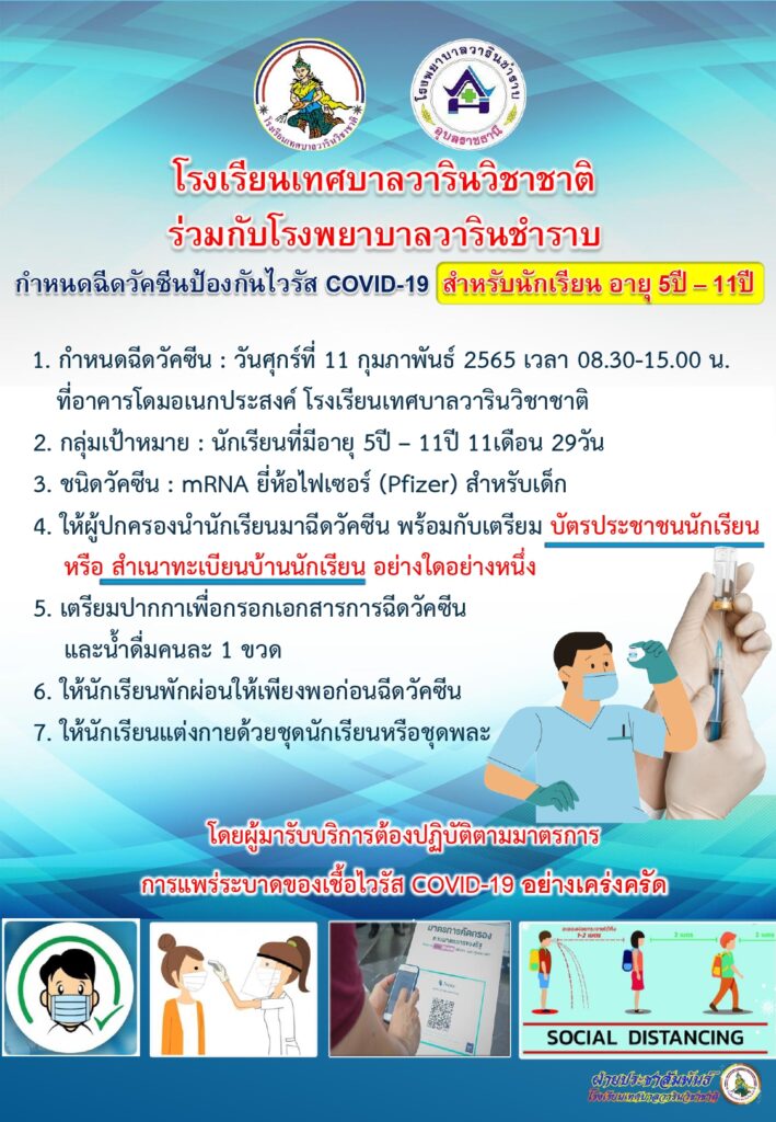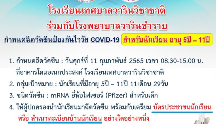 กลุ่มบริหารงานทั่วไปข่าวประชาสัมพันธ์ วันศุกร์ที่ 11 กุมภาพันธ์ 2565 กำหนดฉีดวัคซีนป้องกันไวรัส COVID-19 สำหรับนักเรียน อายุ 5ปี – 11ปี By ปรีชากร นามแสงผา Last updated ก.พ. 8, 2022 0 613 Share 0 613 Share FacebookTwitter