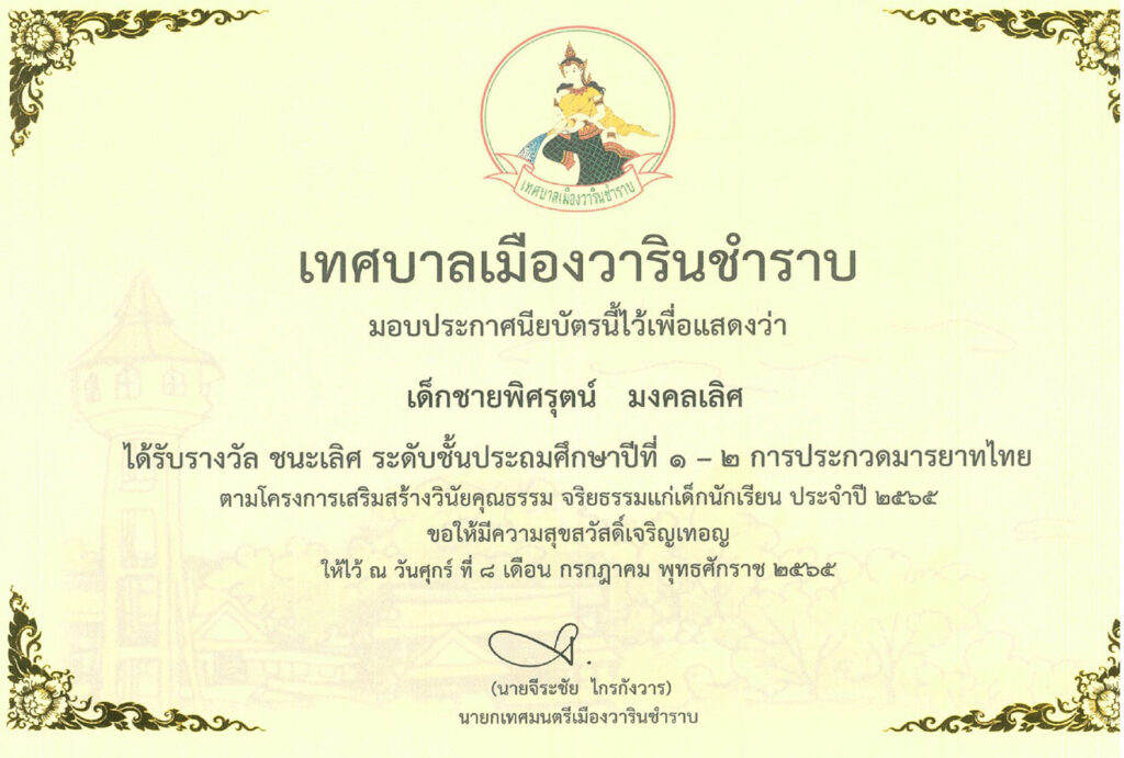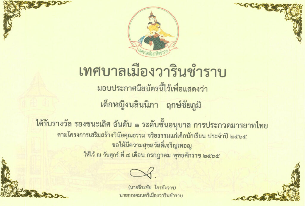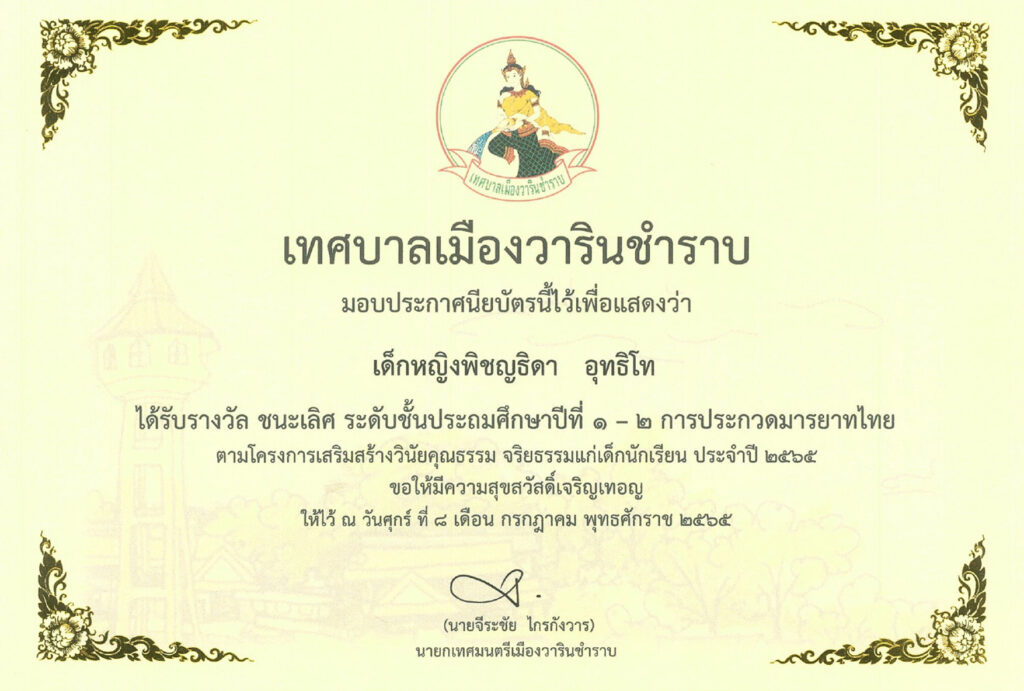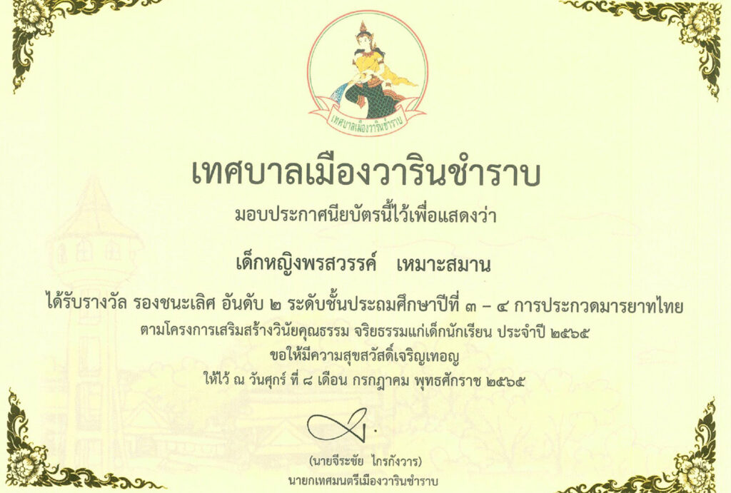 โรงเรียนเทศบาลวารินวิชาชาติขอแสดงความยินดีกับนักเรียนที่ได้รับรางวัลการประกวดมารยาทไทยตามโครงการเสริมสร้างวินัยคุณธรรม จริยธรรมแก่เด็กนักเรียน ประจำปี 2565