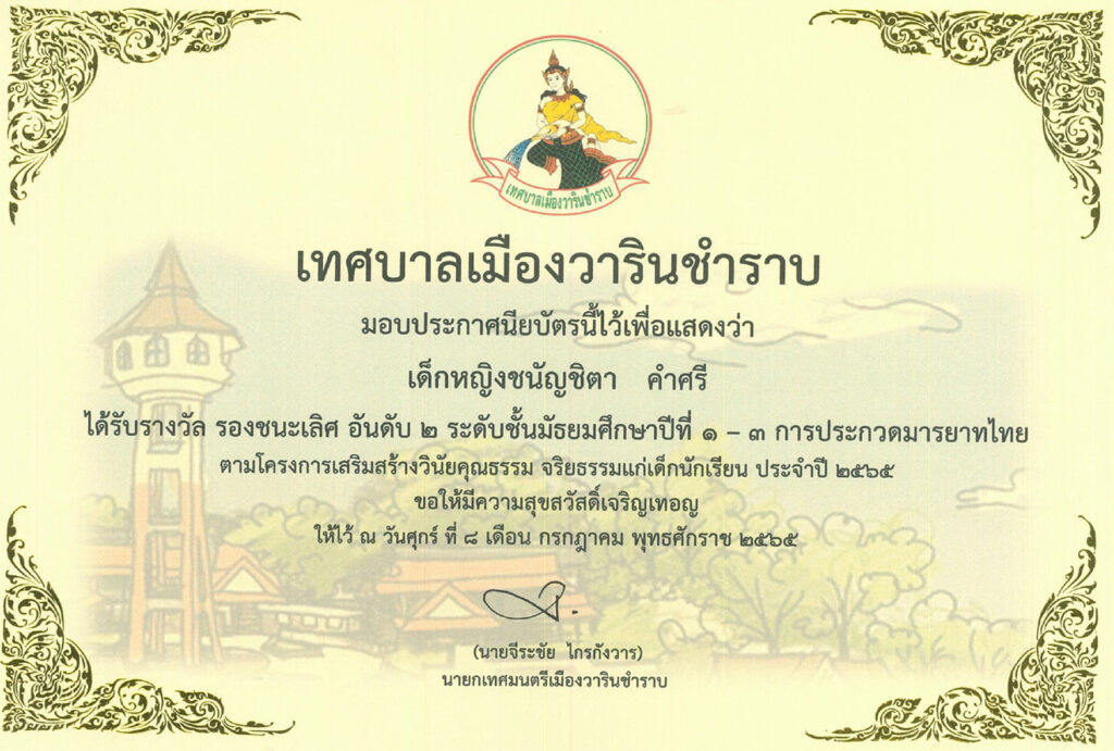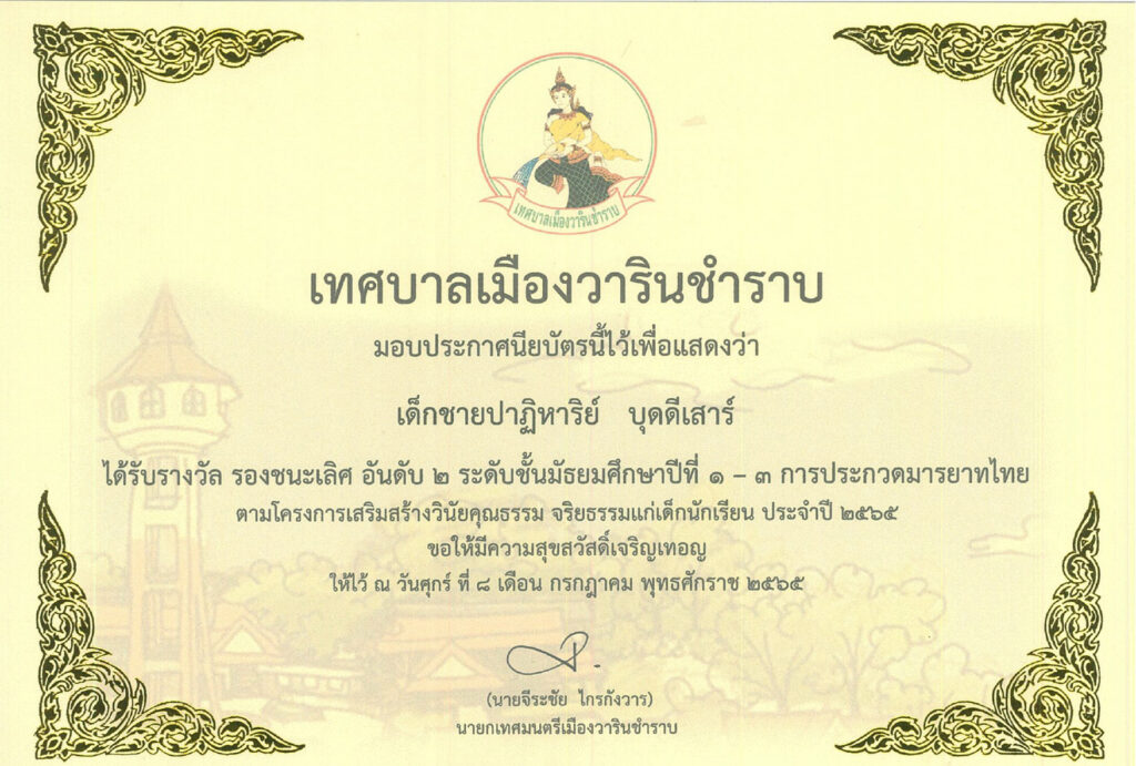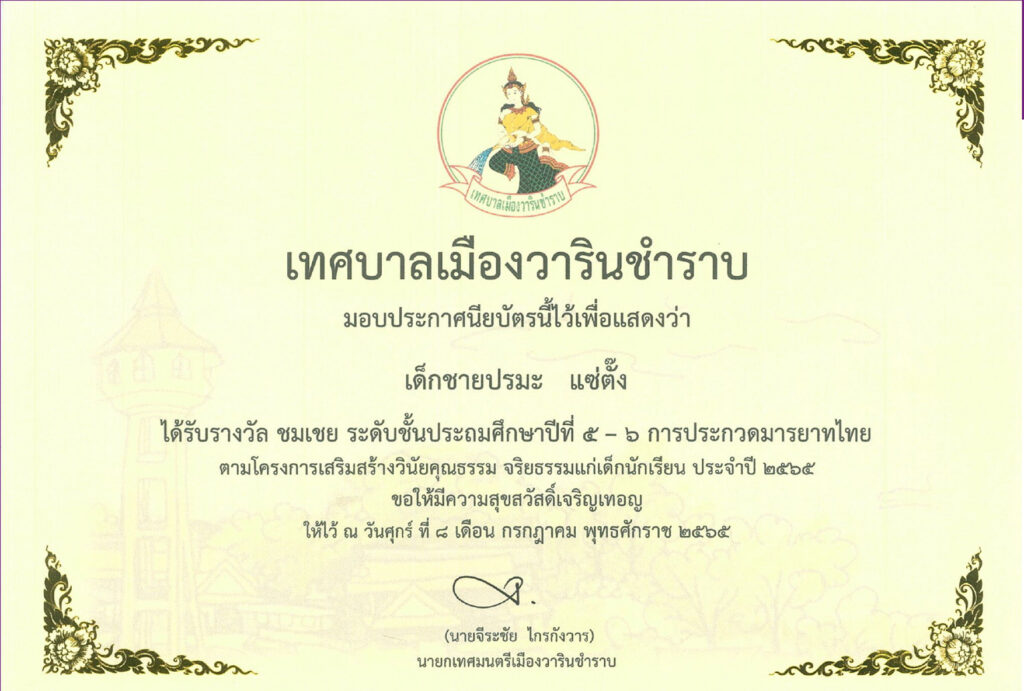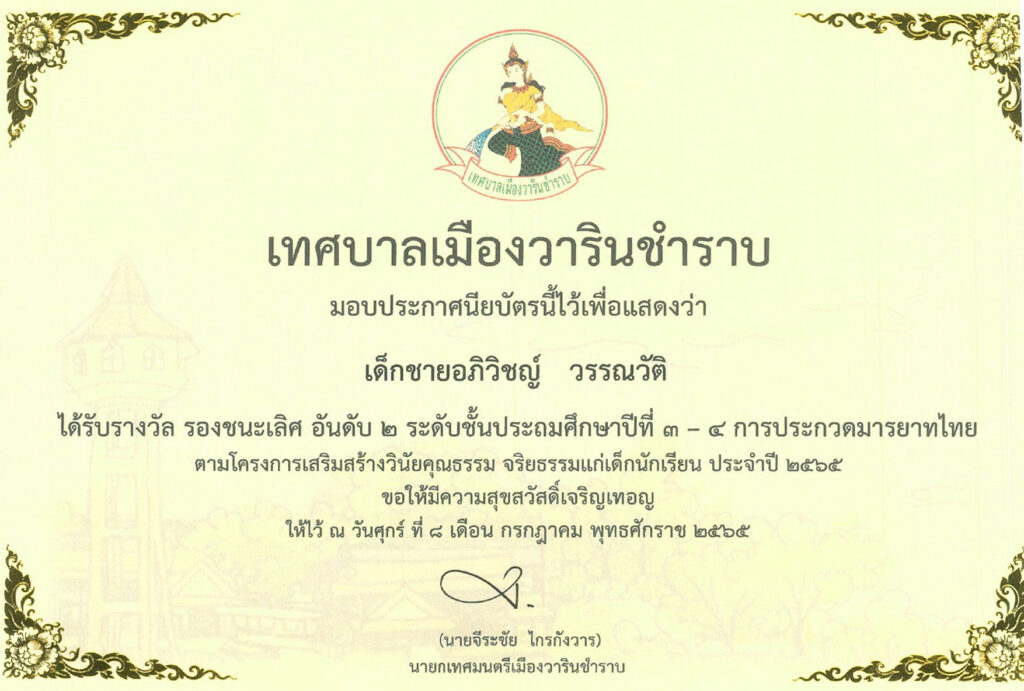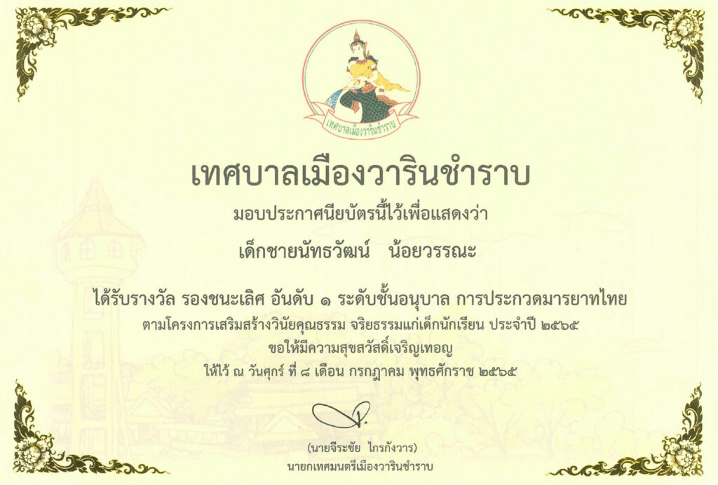 โรงเรียนเทศบาลวารินวิชาชาติขอแสดงความยินดีกับนักเรียนที่ได้รับรางวัลการประกวดมารยาทไทยตามโครงการเสริมสร้างวินัยคุณธรรม จริยธรรมแก่เด็กนักเรียน ประจำปี 2565