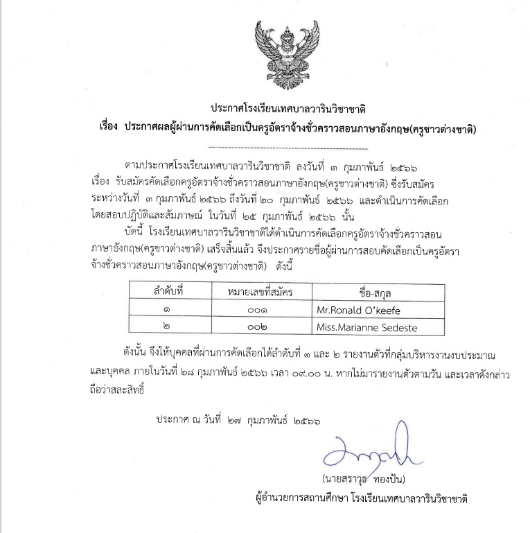 รายชื่อผู้ผ่านการคัดเลือกเป็นครูอัตราจ้างชั่วคราวสอนภาษาอังกฤษ (ครูต่างชาติ)