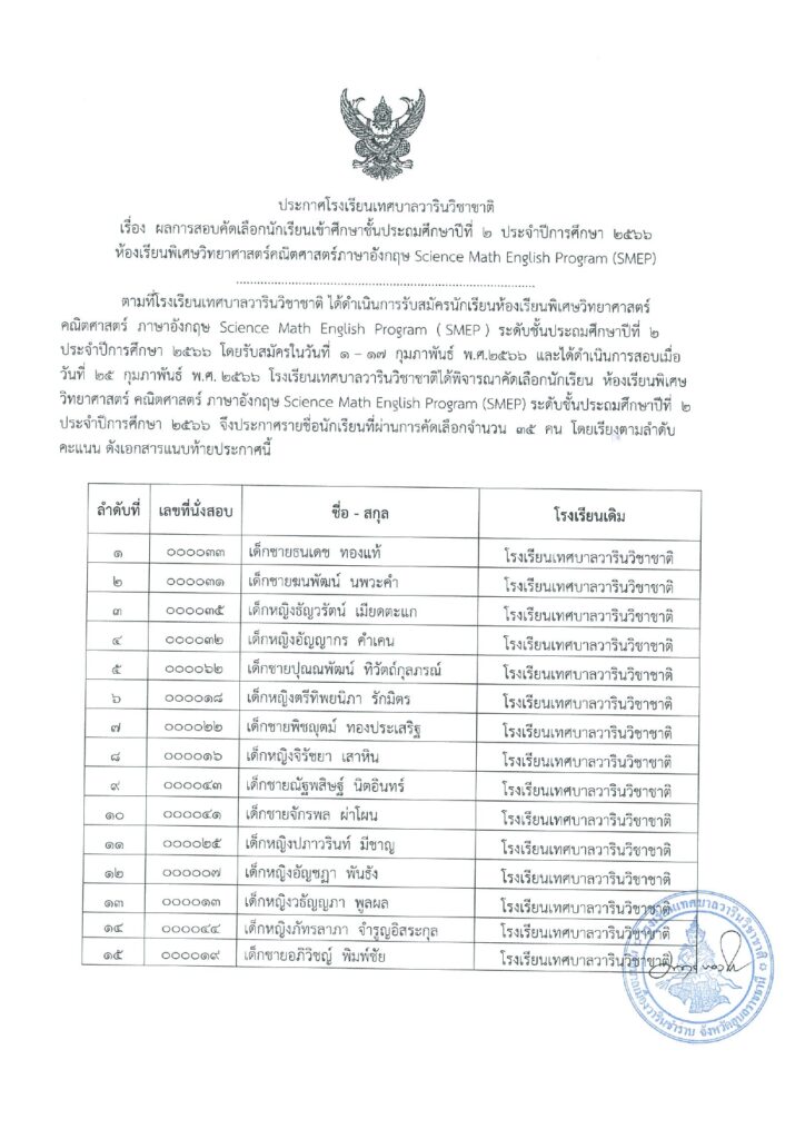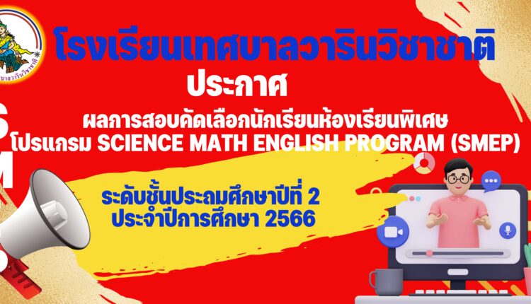 ข่าวประชาสัมพันธ์ ประกาศผลการสอบคัดเลือกนักเรียนห้องเรียนพิเศษ โปรแกรม Science Math English Program (SMEP) ระดับชั้นประถมศึกษาปีที่ 2 ประจำปีการศึกษา 2566 By ปรีชากร นามแสงผา Last updated มี.ค. 1, 2023 0 527 Share 0 527 Share FacebookTwitter