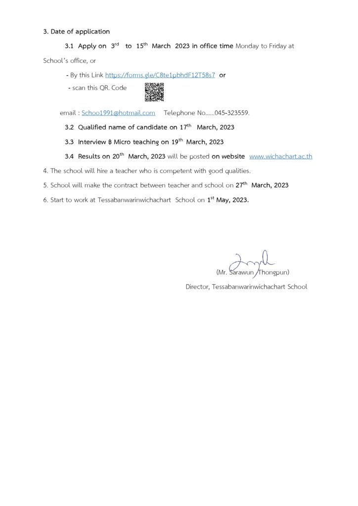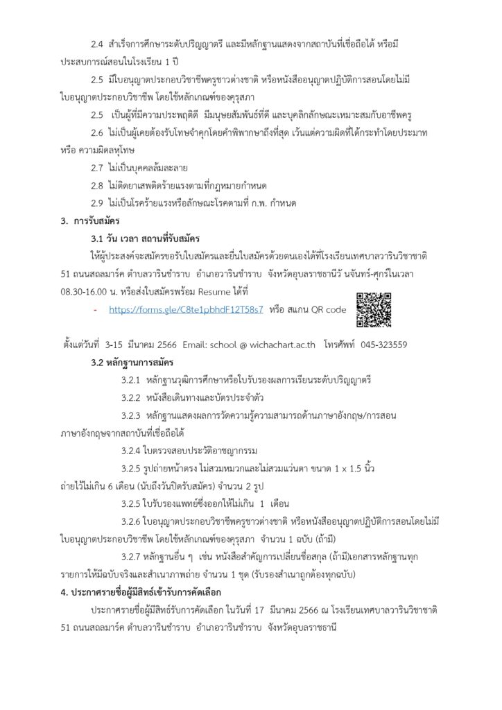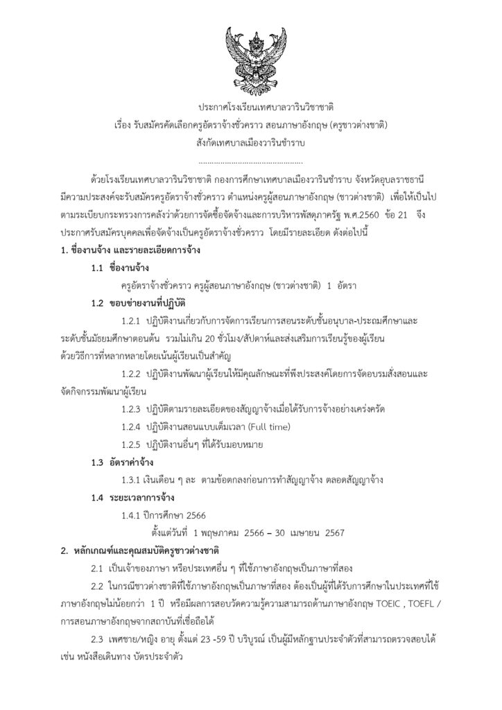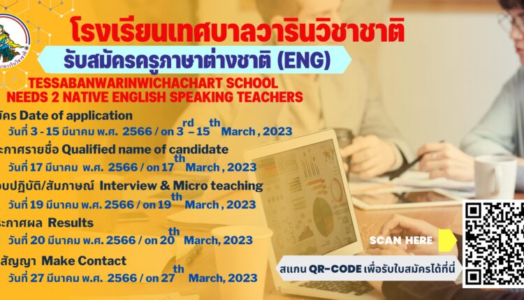 กลุ่มบริหารงานงบประมาณและบุคคลข่าวประชาสัมพันธ์ ประกาศโรงเรียนเทศบาลวารินวิชาชาติ การรับสมัครคัดเลือกครูอัตราจ้างชั่วคราว สอนภาษาอังกฤษ (ครูชาวต่างชาติ) สังกัดเทศบาลเมืองวารินชำราบ By ปรีชากร นามแสงผา Last updated มี.ค. 3, 2023 0 730 Share 0 730 Share FacebookTwitter