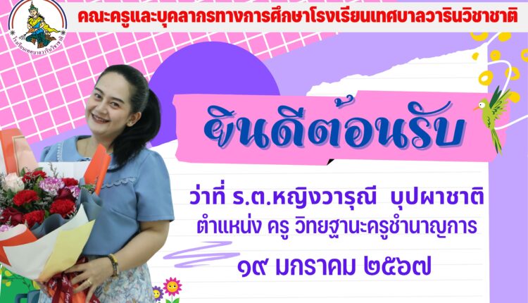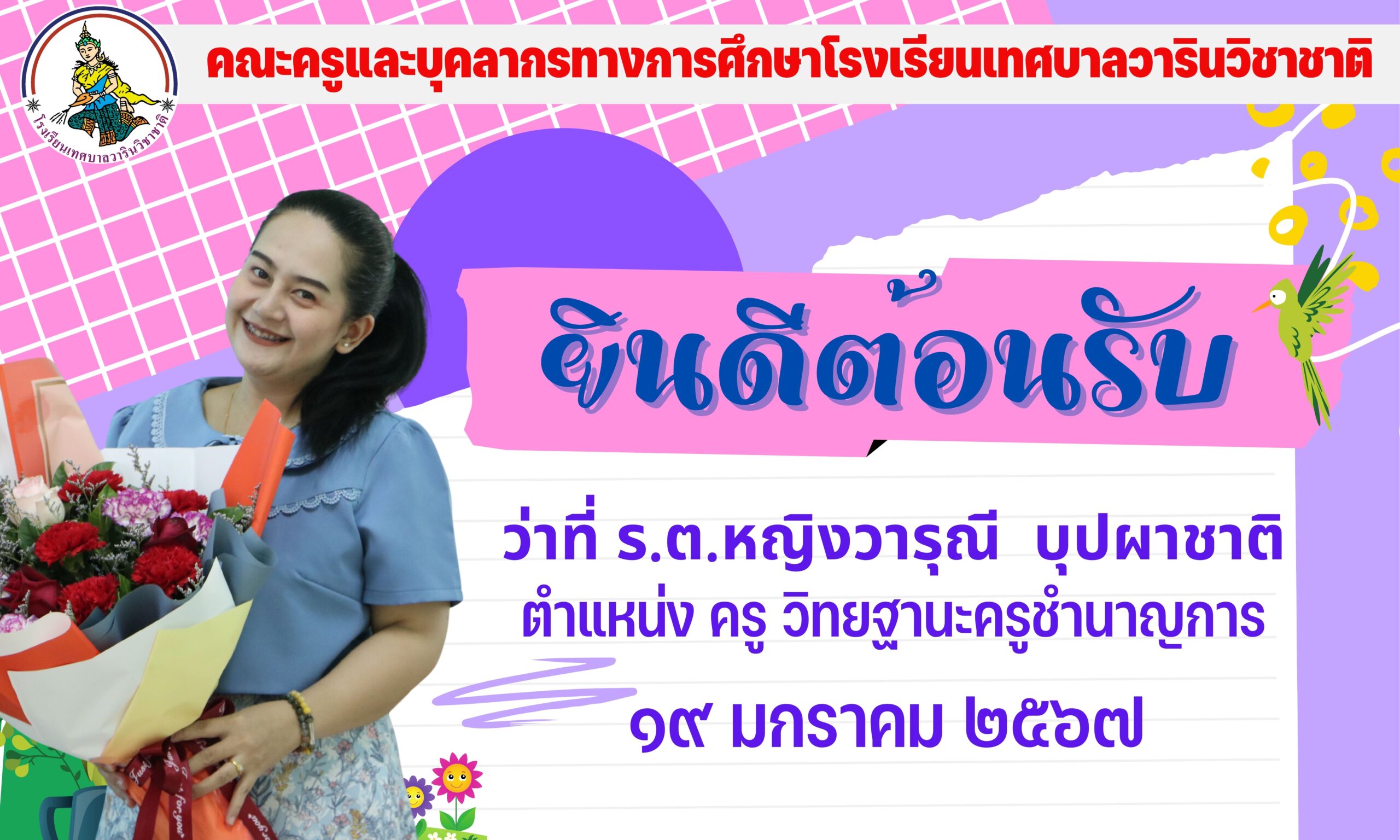 วันที่ 19 มกราคม 2567 โรงเรียนเทศบาลวารินวิชาชาติยินดีต้อนรับ ว่าที่ร้อยตรีหญิงวารุณี บุปผาชาติ ตำแหน่งครู วิทยฐานะครูชำนาญการ โอนย้ายมาจากโรงเรียนกีฬาหมื่นศรีวิทยานุสรณ์ สังกัดเทศบาลตำบลหมื่นศรี อำเภอสำโรงทาบ จังหวัดสุรินทร์ ด้วยความยินดียิ่ง