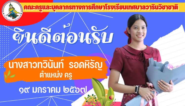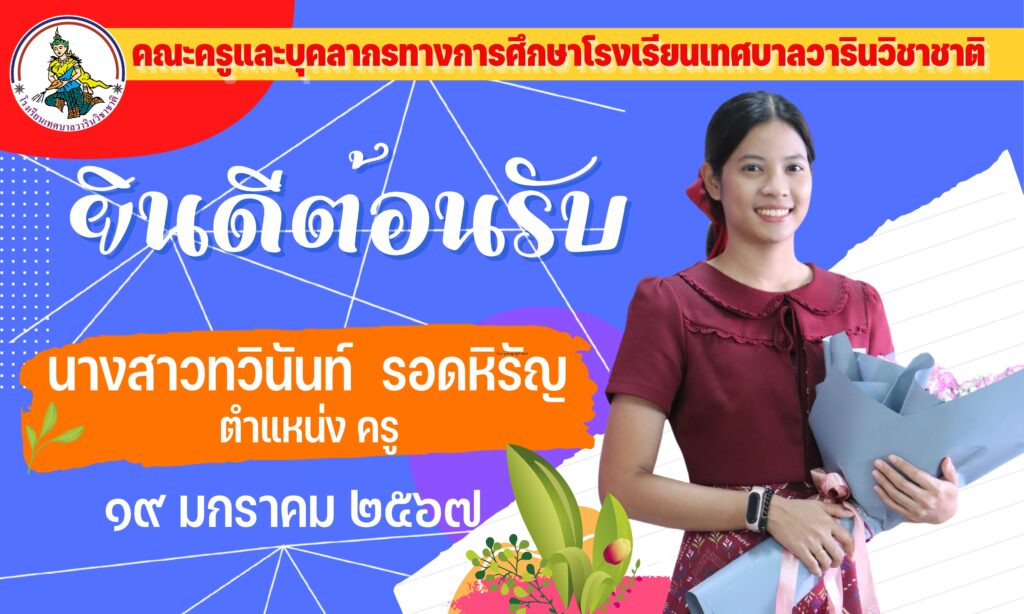 วันที่ 19 มกราคม 2567 โรงเรียนเทศบาลวารินวิชาชาติยินดีต้อนรับ นางสาวทวินันท์ รอดหิรัญ ตำแหน่งครู โอนย้ายมาจากโรงเรียนบ้านหนองแสงเจริญพัฒนา อำเภอบุณฑริก จังหวัดอุบลราชธานี สังกัดสำนักงานเขตพื้นที่การศึกษาประถมศึกษาอุบลราชธานี เขต5 ด้วยความยินดียิ่ง