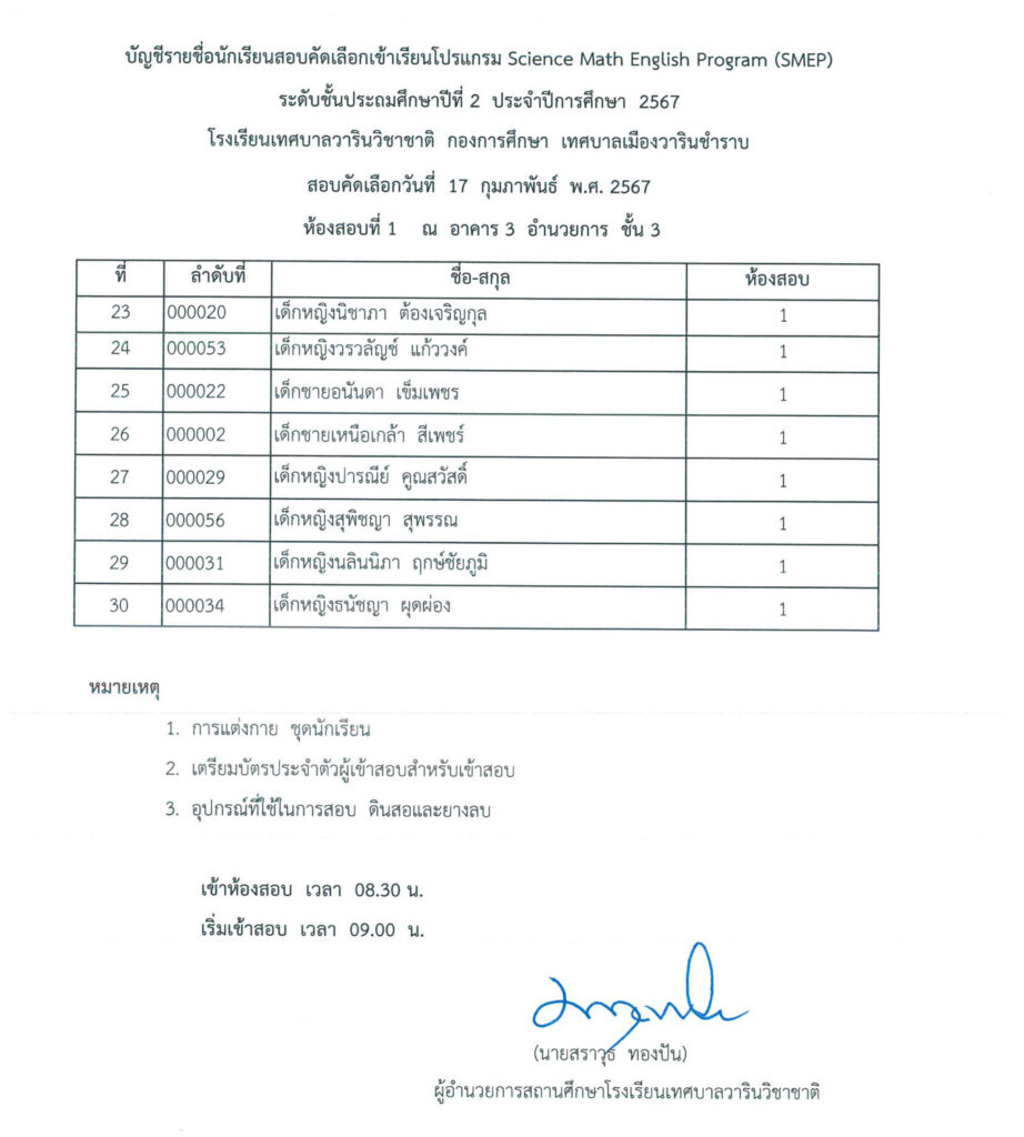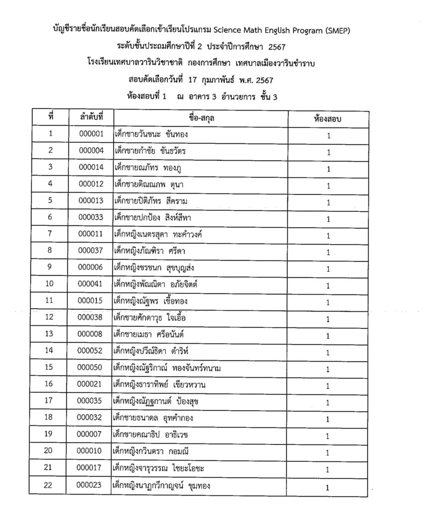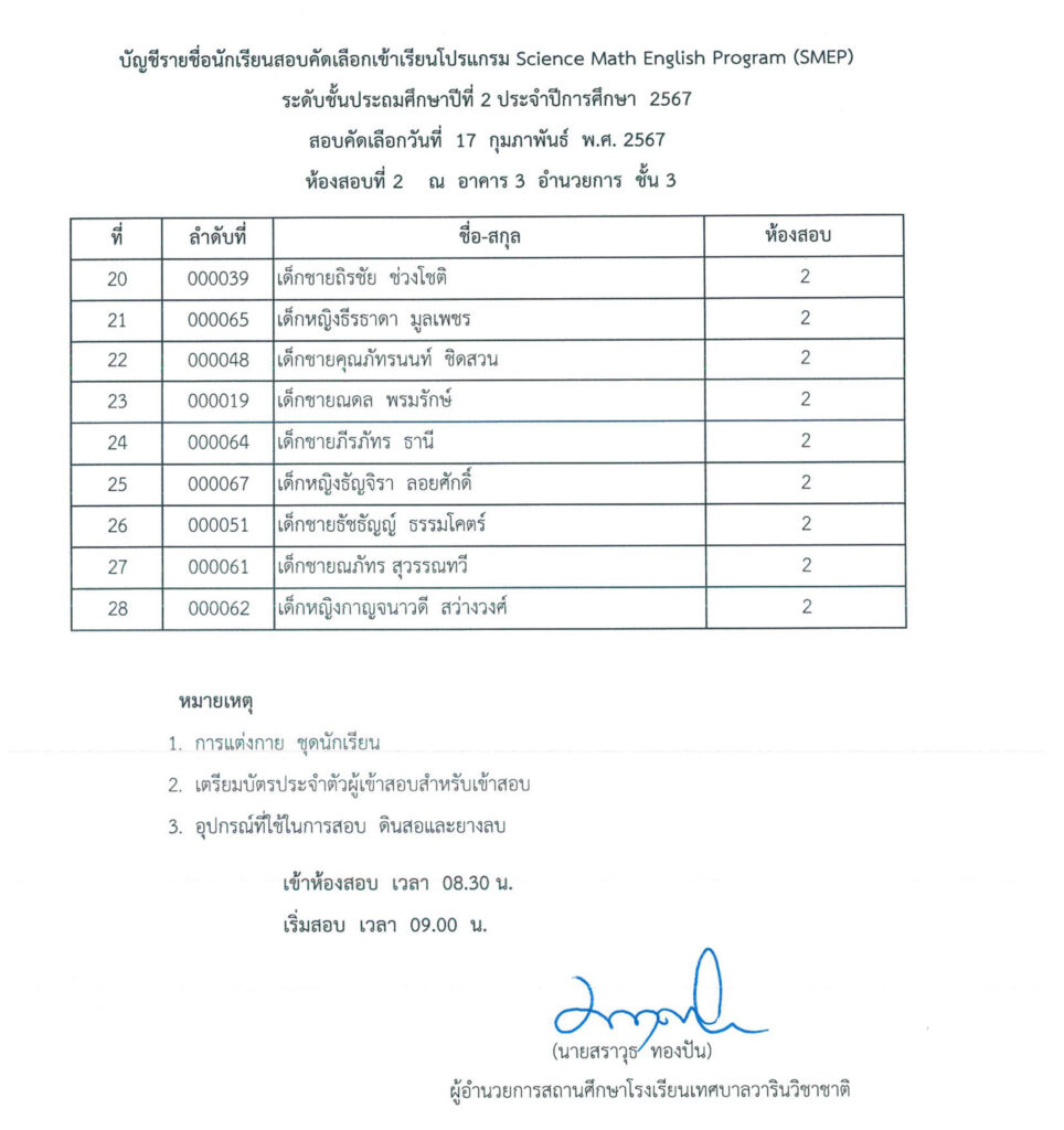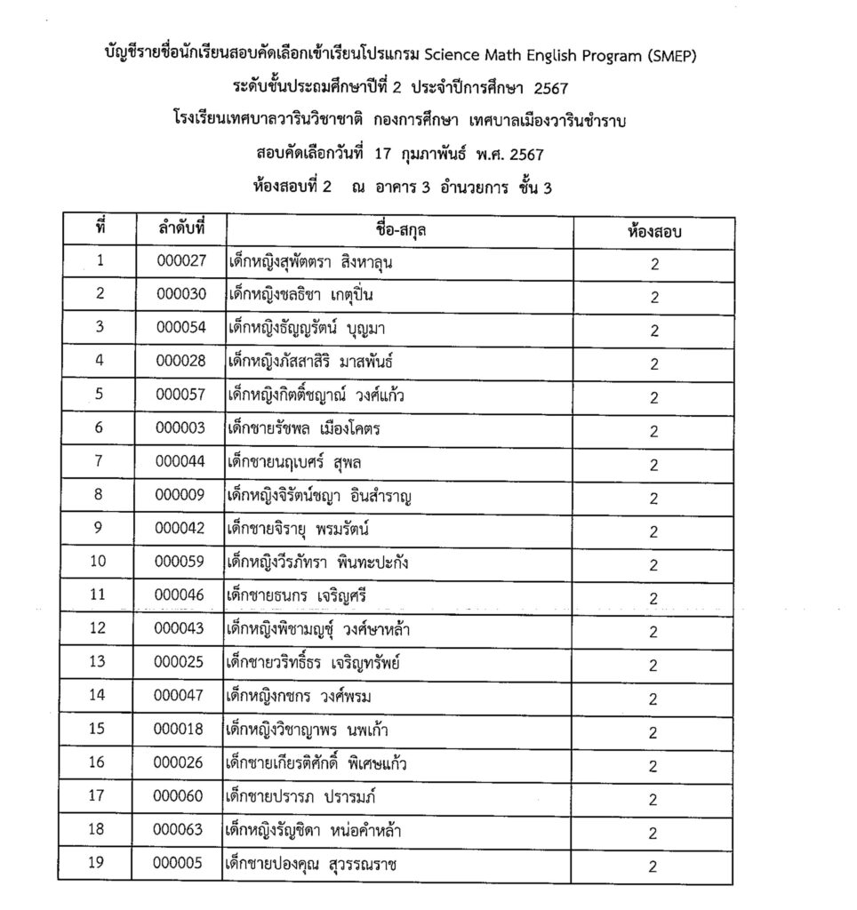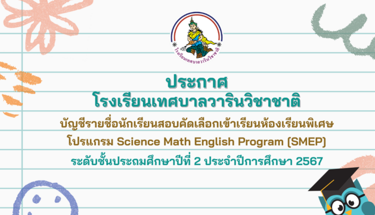 รายชื่อนักเรียนสอบคัดเลือกเข้าเรียนห้องเรียนพิเศษชั้นประถมศึกษาปีที่ 2 โปรแกรม Science Math English Program [SMEP]