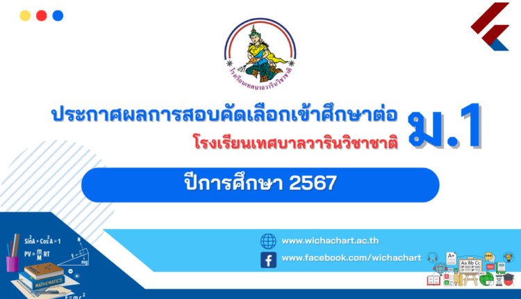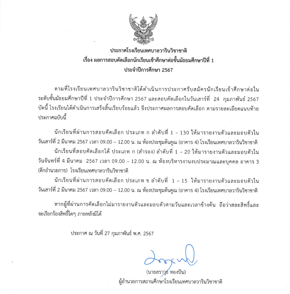 ประกาศ ผลการสอบคัดเลือกเข้าศึกษาต่อชั้นมัธยมศึกษาปีที่ 1