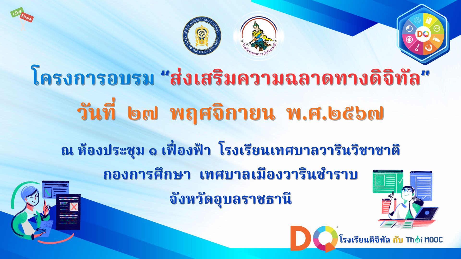 โรงเรียนเทศบาลวารินวิชาชาติ ได้จัดโครงการอบรม “ส่งเสริมความฉลาดทางดิจิทัล” ให้กับนักเรียนชั้นมัธยมศึกษาปีที่ 1 โดยมี ดร.สราวุธ ทองปัน ผู้อำนวยการสถานศึกษา โรงเรียนเทศบาลวารินวิชาชาติ เป็นประธานในพิธิี และมีรองผู้อำนวยการทั้ง 4 ฝ่าย พร้อมหัวหน้าสายชั้น เข้าร่วมในพิธีเปิดการอบรม โดยมีคณะครูสายชั้นมัธยมศึกษาปีที่ 1 เป็นวิทยาการให้ความรู้ในการอบรม ซึ่งมีนักเรียนชั้น ม.1 จำนวน 170 เข้าร่วมรับการอบรม เพื่อปลูกฝักนักเรียนให้รู้จักภัย และการต่อสู้กับโลกยุคดิจิทัลได้อย่างปลอดภัย