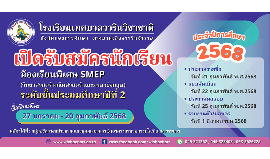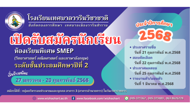ประกาศ รับสมัครนักเรียนห้องเรียนพิเศษ วิทยาศาสตร์ คณิตศาสตร์ ภาษาอังกฤษ (SMEP) ชั้นประถมศึกษาปีที่ 2 ปีการศึกษา 2568