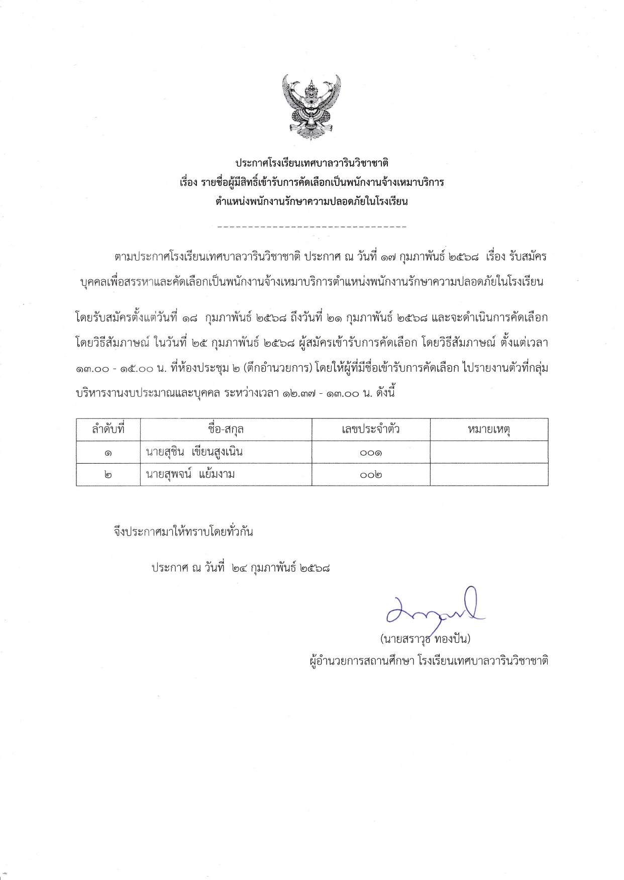 ประกาศ รายชื่อผู้มีสิทธิ์เข้ารับการคัดเลือกเป็นพนักงานจ้างเหมาบริหาร ตำแหน่ง พนักงานรักษาความปลอดภัยในโรงเรียน