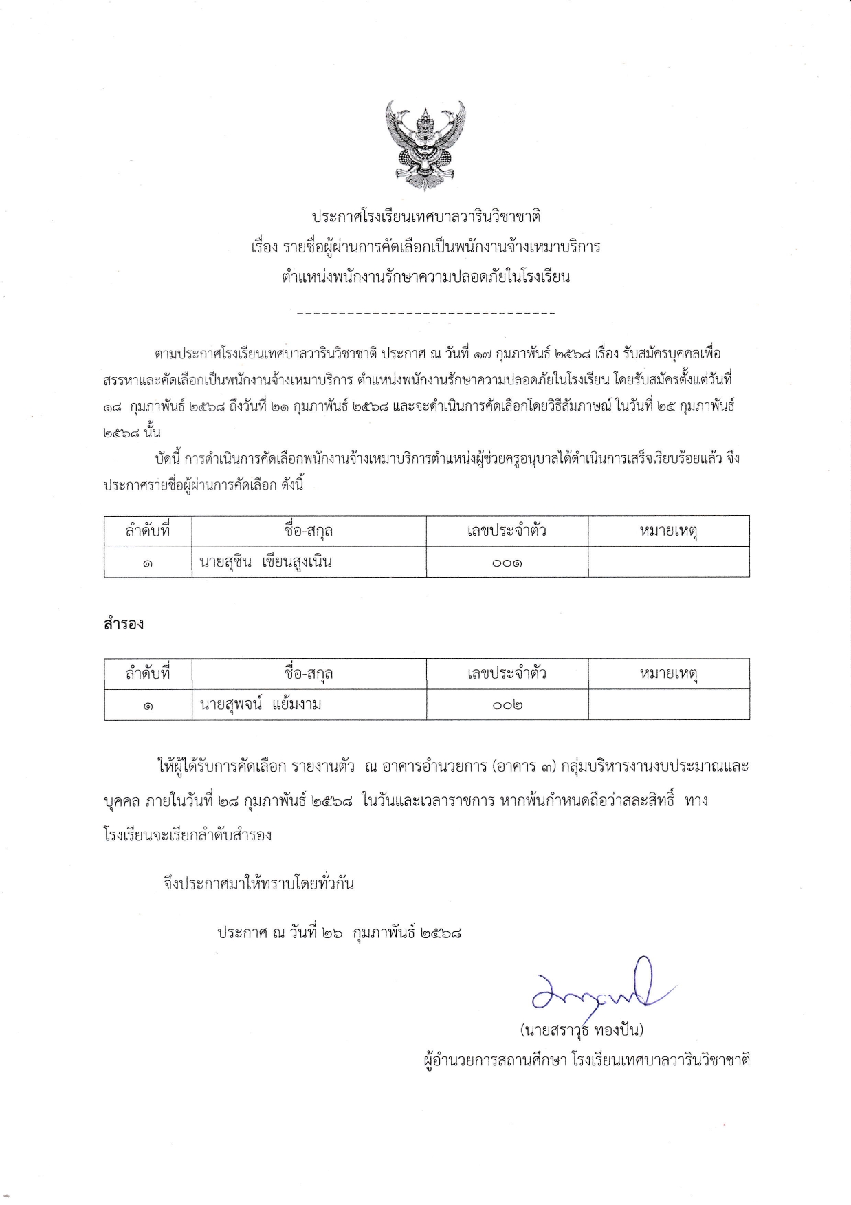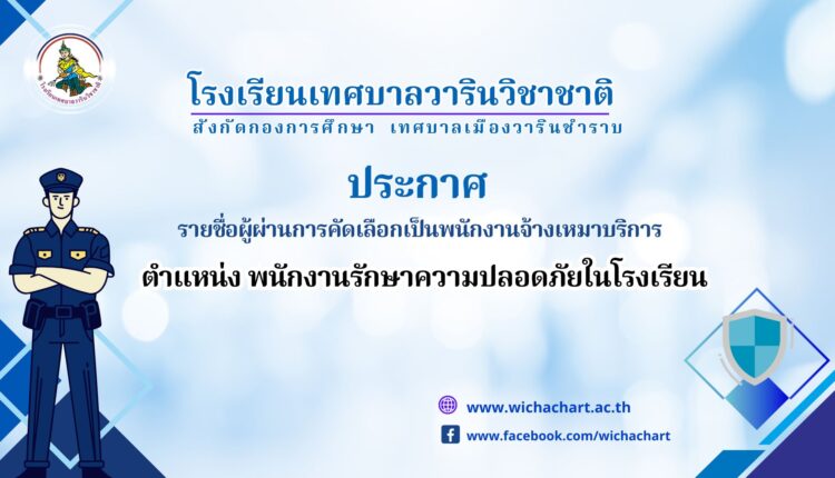 ประกาศ รายชื่อผู้ผ่านการคัดเลือกเป็นพนักงานจ้างเหมาบริการ ตำแหน่ง พนักงานรักษาความปลอดภัยในโรงเรียน
