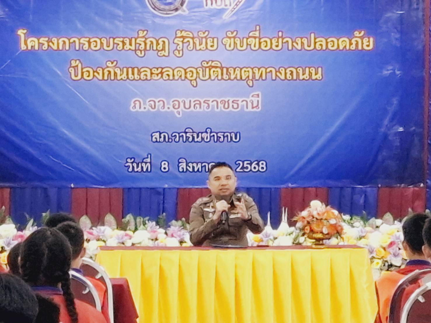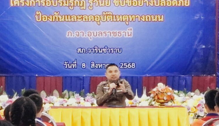 วันที่ 8 สิงหาคม 2568 โรงเรียนเทศบาลวารินวิชาชาติ นำโดย ดร.สราวุธ ทองปัน ผู้อำนวยการสถานศึกษา ร่วมกับ ภ.จว.อุบลราชธานีและ สภ.วารินชำราบจัดอบรมโครงการอบรมรู้กฎ รู้วินัย ขับขี่ปลอดภัย ป้องกันและลดอุบัติเหตุทางถนนให้กับนักเรียนจิตอาสาจราจรโรงเรียนเทศบาลวารินวิชาชาติ