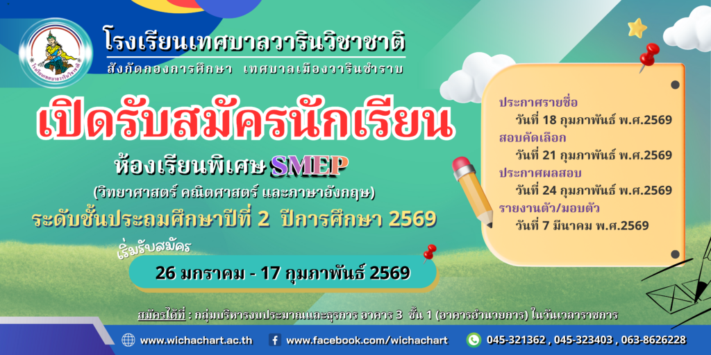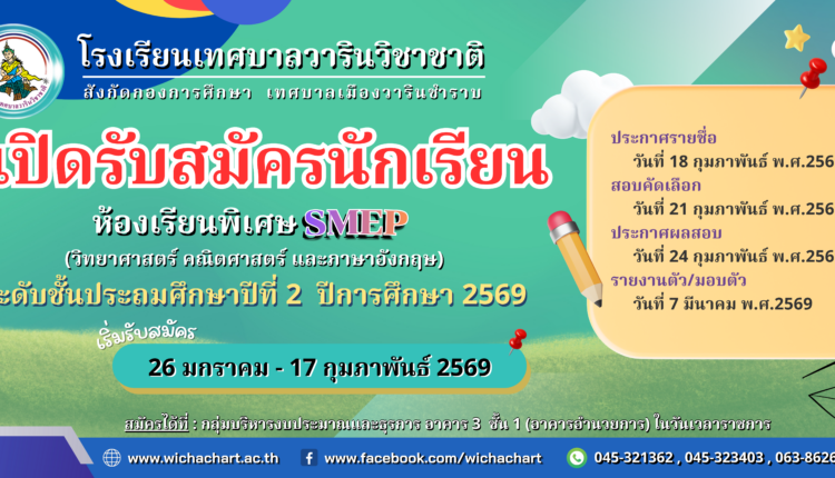 ประกาศ รับสมัครนักเรียนห้องเรียนพิเศษ วิทยาศาสตร์ คณิตศาสตร์ ภาษาอังกฤษ (SMEP) ชั้นประถมศึกษาปีที่ 2 ปีการศึกษา 2569
