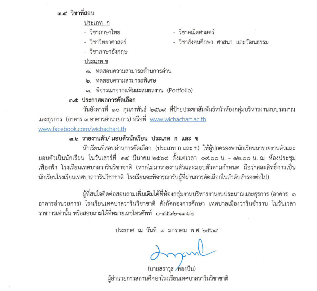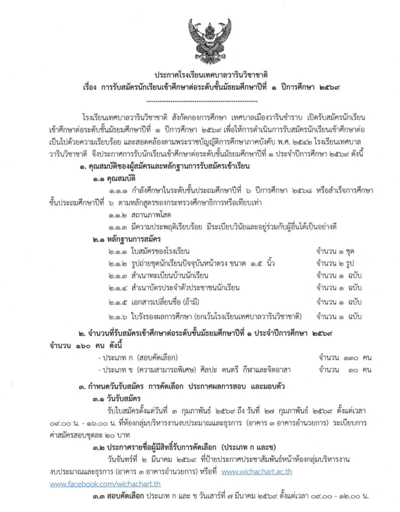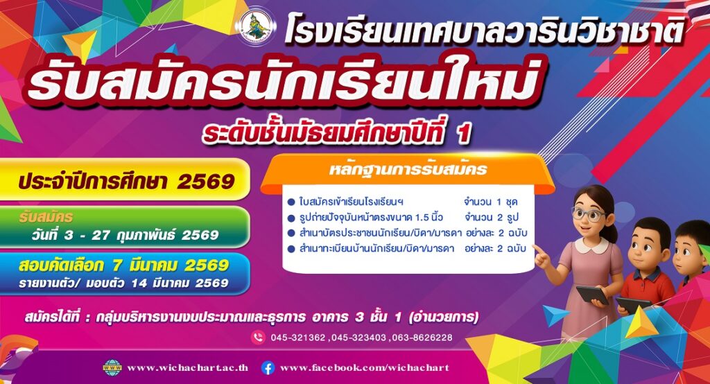 โรงเรียนเทศบาลวารินวิชาชาติ เปิดรับสมัครนักเรียนเข้าเรียนชั้นมัธยมศึกษาปีที่ 1 ปีการศึกษา 2569 ผู้สนใจสามารถนำบุตรหลานสมัครเข้าเรียนชั้นมัธยมศึกษาปีที่ 1 ได้ที่กลุ่มบริหารงบประมาณและธุรการ อาคาร 3 (อำนวยการ) ชั้น 1 ได้ในวันเวลาราชการ หรือสอบถามเพิ่มเติม 045-321362 , 045-323403 หรือ 063-8626228