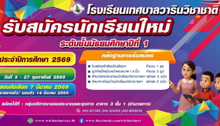 เปิดรับสมัครนักเรียนใหม่ประจำปีการศึกษา 2569 ระดับชั้นมัธยมศึกษาปีที่ 1