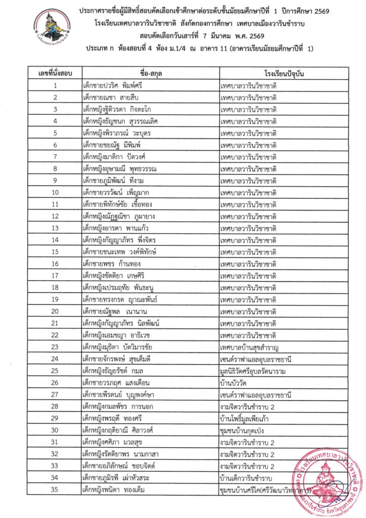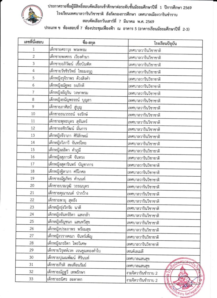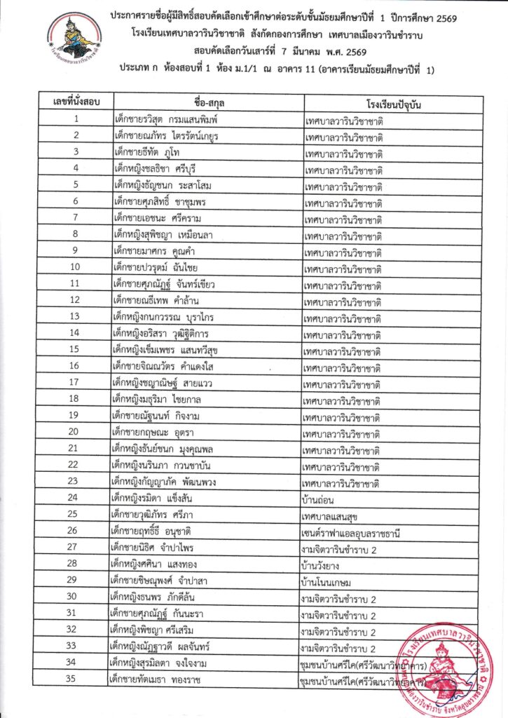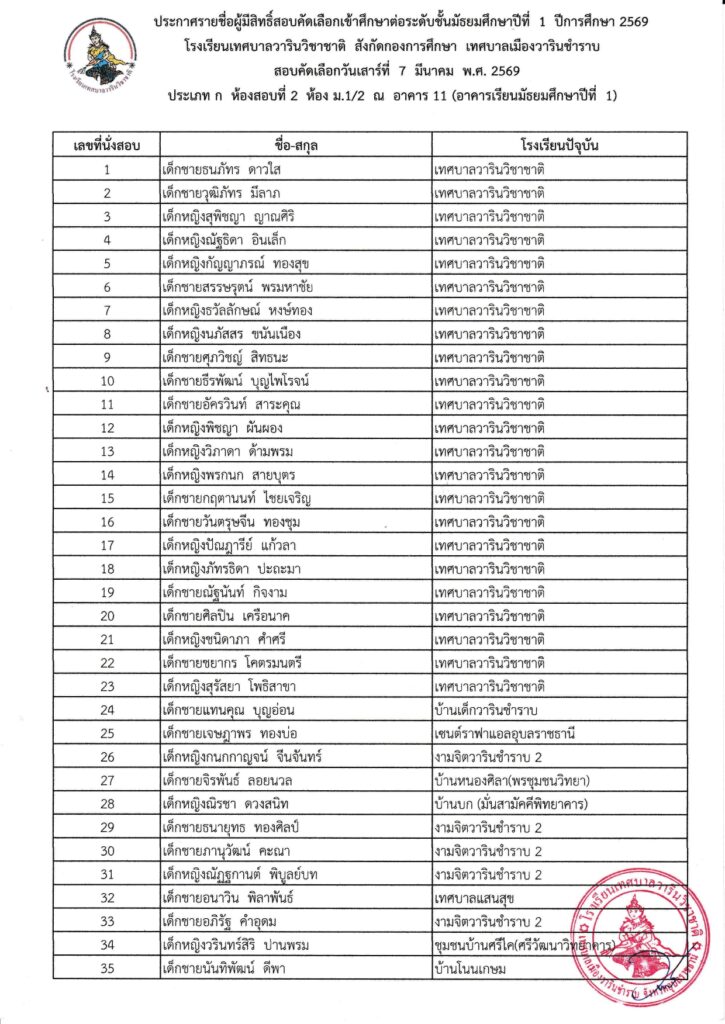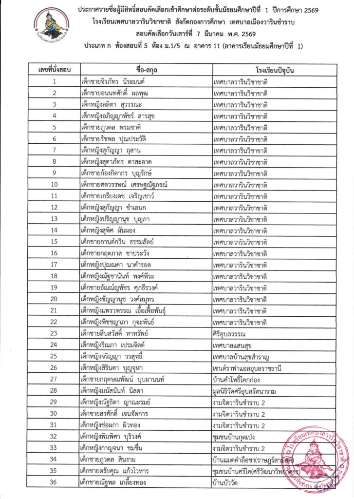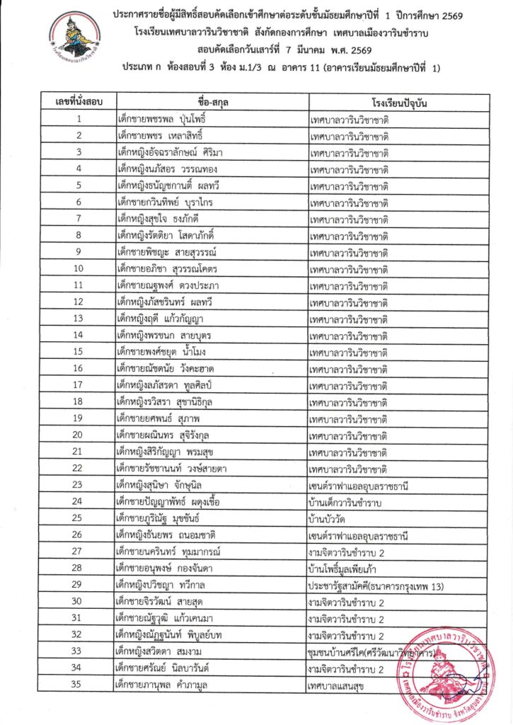 รายชื่อนักเรียนผู้มีสิทธิ์สอบคัดเลือกเข้าศึกษาต่อระดับชั้นมัธยมศึกษาปีที่ 1 ปีการศึกษา 2569